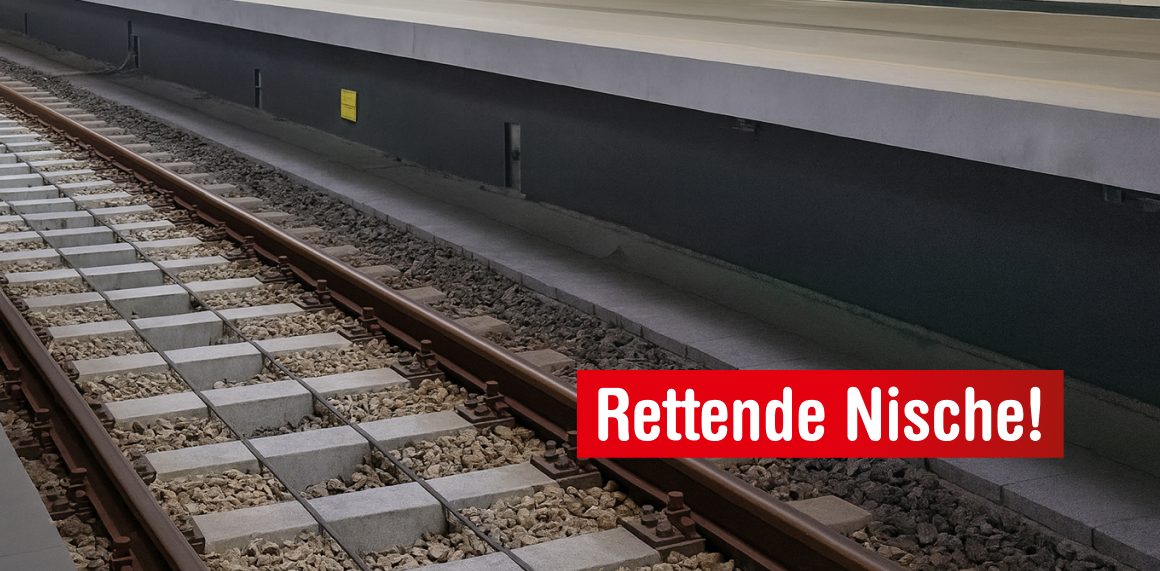 Bringen Sie sich sofort in der Nische unter dem Bahnsteig in Sicherheit – dort sind Sie geschützt, bis Hilfe kommt (U1, U2, U3, U4).